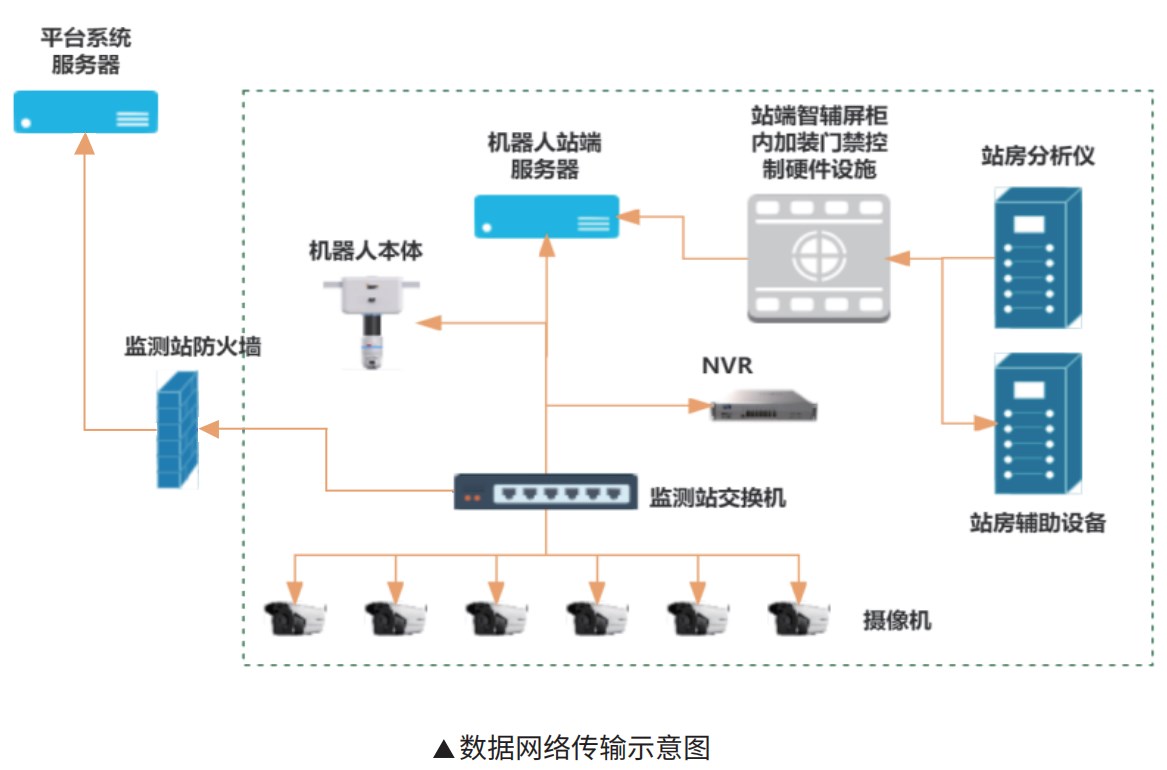 數(shù)據(jù)傳輸更是系統(tǒng)中的關(guān)鍵。運(yùn)維機(jī)器人通過(guò)TCP協(xié)議接入站端服務(wù)器,站房分析儀和輔助設(shè)備數(shù)據(jù)實(shí)時(shí)上傳,而攝像機(jī)視頻數(shù)據(jù)通過(guò)交換機(jī)接入NVR,再傳送至站端服務(wù)器。站端服務(wù)器匯總站房監(jiān)測(cè)數(shù)據(jù),經(jīng)防火墻上傳至上級(jí)平臺(tái)系統(tǒng)服務(wù)器,確保數(shù)據(jù)傳輸?shù)陌踩€(wěn)定。
