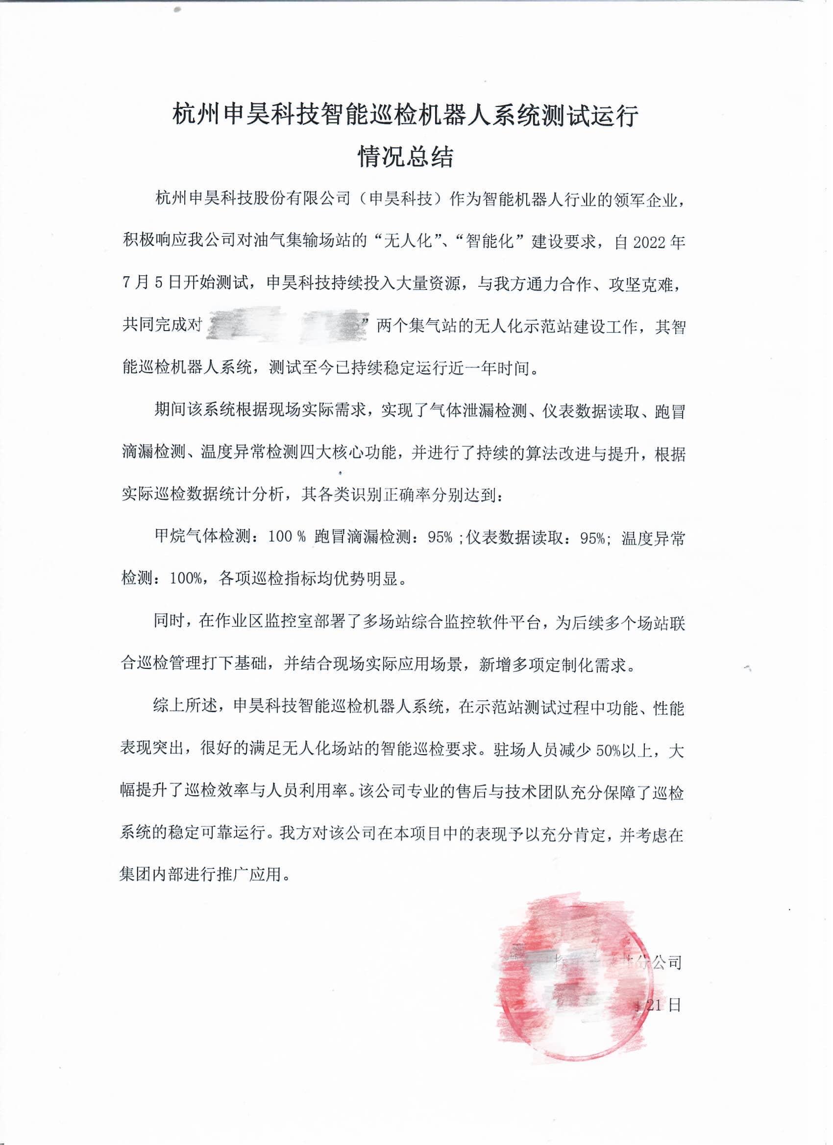 申昊科技積極響應油氣集輸場站的“無人化”、“智能化”建設要求,與相關單位通力合作、攻堅克難共同完成示范站建設工作。如今油田多了一位“智能幫手”——申昊科技機器人智能巡檢系統,成為了擁有智慧的“無人化場站”示范站,該系統已經成功連續運行一年,獲得了客戶的高度評價。